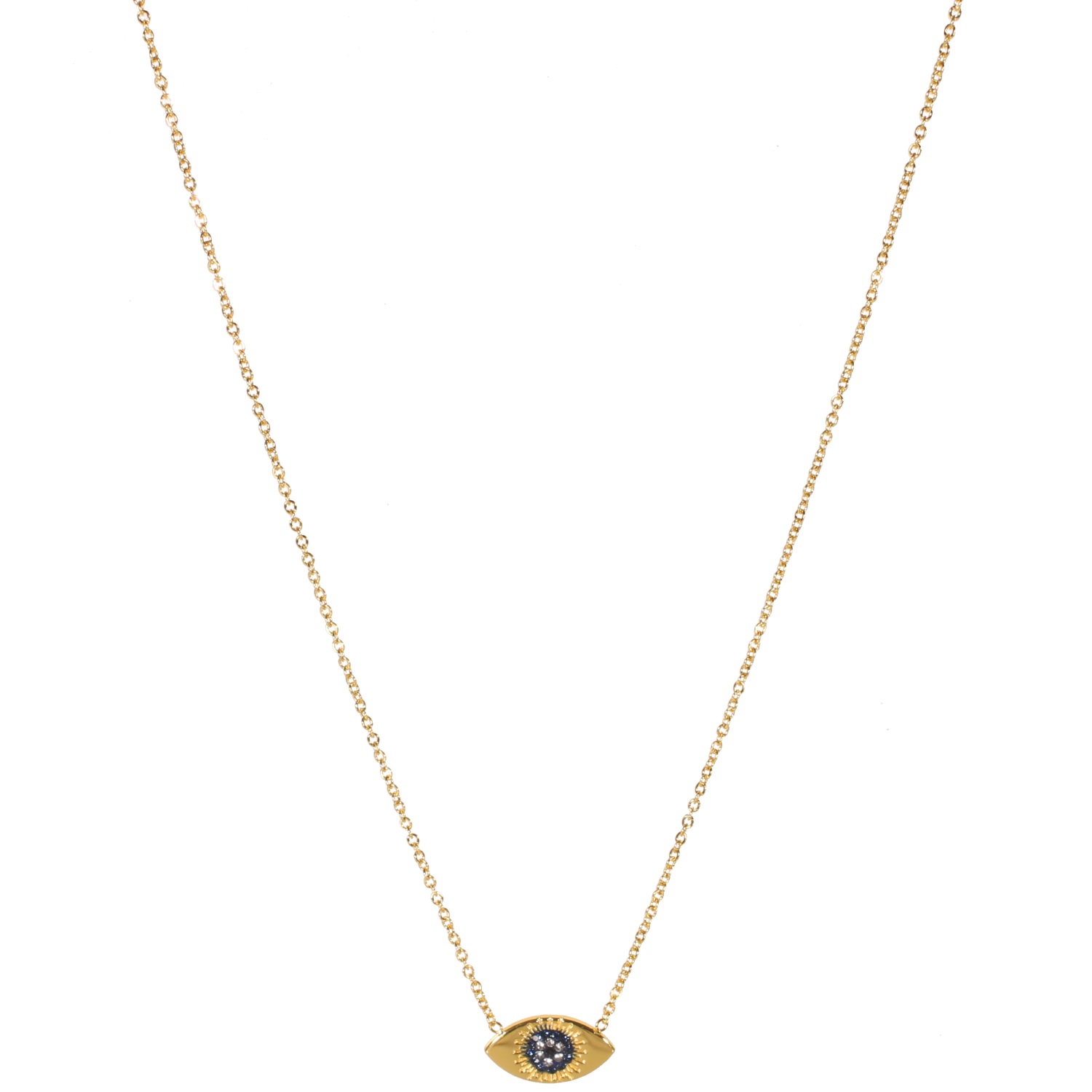 Collier composé d'une chaîne fine et d'un œil de Turquie en acier doré surmonté de strass de couleur noire, bleue et blanche.