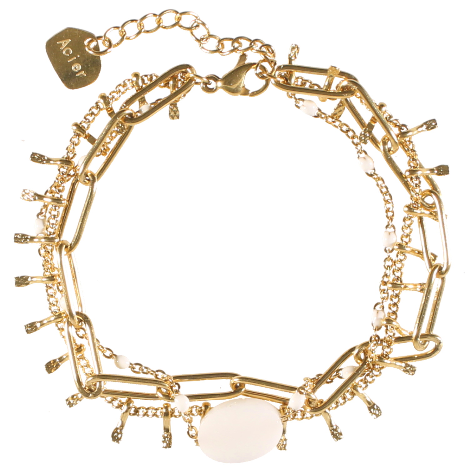 Bracelet triple rangs composé d'une chaîne avec pampilles en acier doré, d'une chaîne grosse maille en acier doré et d'une chaîne en acier doré avec perles en émail de couleur blanche et d'une pierre de couleur blanche.