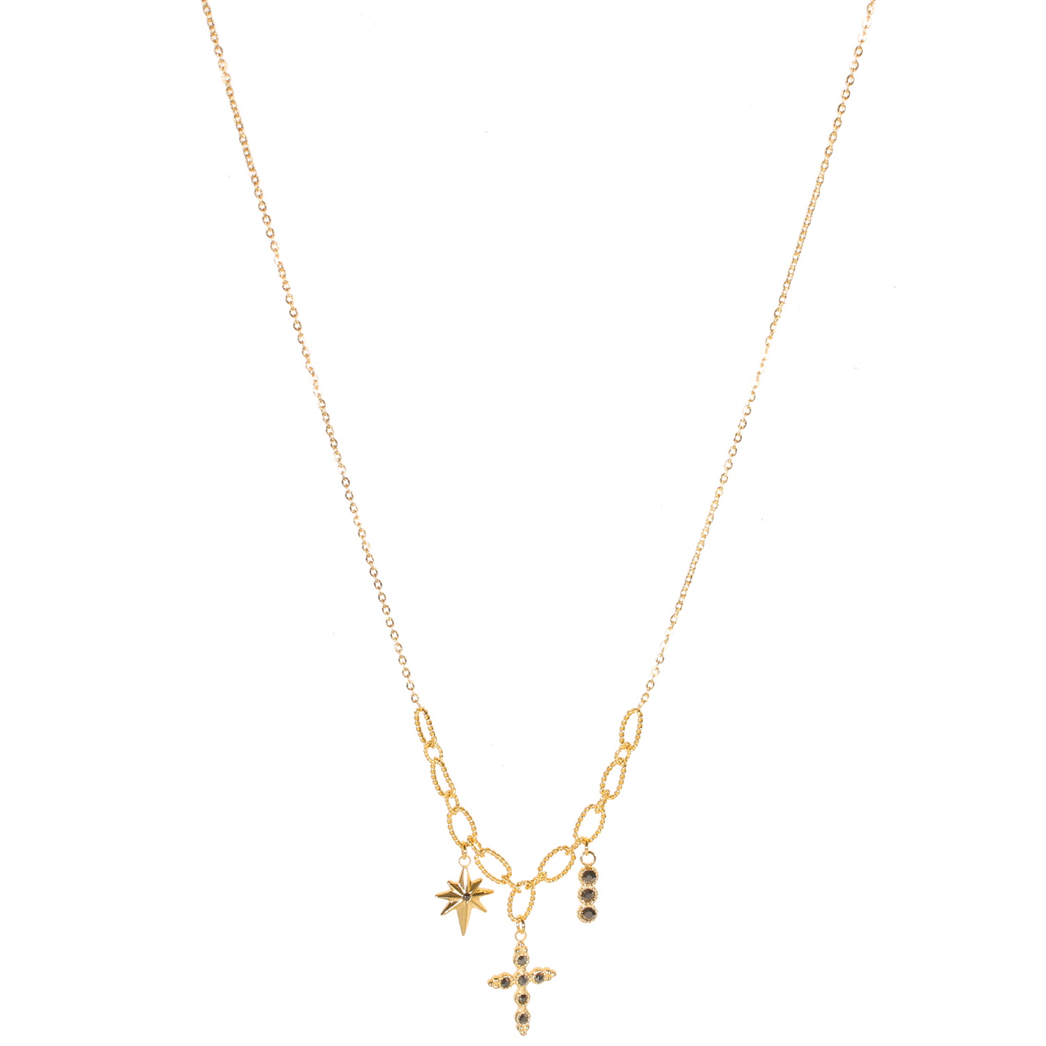 Collier composé d'une chaîne en acier doré et de trois pendentifs, une croix pavée de cristaux de couleur grise, une barre de trois cristaux sertis clos de forme ronde et une étoile sertie d'un cristal.