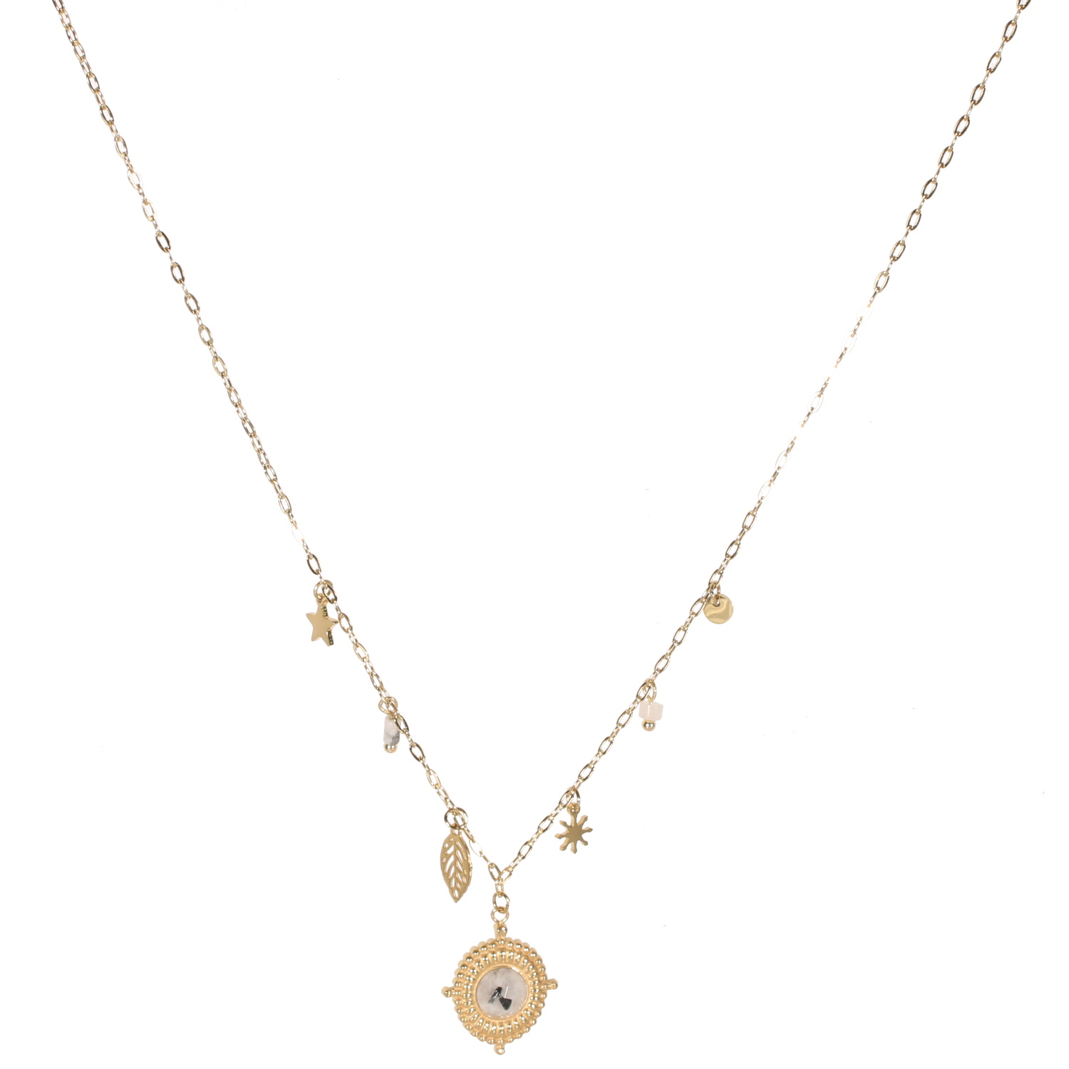 Collier composé d'une chaîne avec pendants feuille, étoile, pastille ronde en acier doré, des perles pendantes en véritable pierre de lune et d'un pendentif ovale en acier doré surmonté d'une véritable pierre de lune.