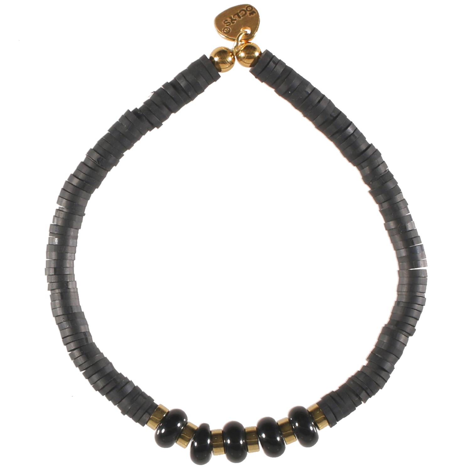 Description Bracelet élastique composé de perles cylindriques en acier doré, de perles cylindriques heishi en caoutchouc de couleur noire et perles de couleur noire. Cliquez sur une matière, un thème, une couleur ou une collection pour voir tous les articles associés.