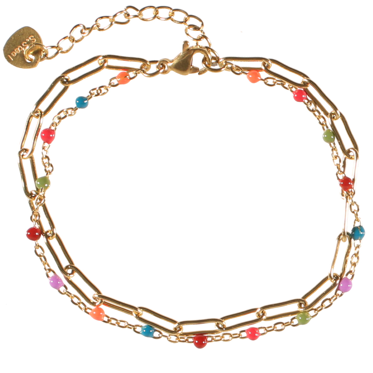 Description Bracelet double rangs composé d'une chaîne en acier doré et d'une chaîne en acier doré avec perles en émail multicolore. Fermoir mousqueton avec 4 cm de rallonge. Cliquez sur une matière, un thème, une couleur ou une collection pour voir tous les articles associés.