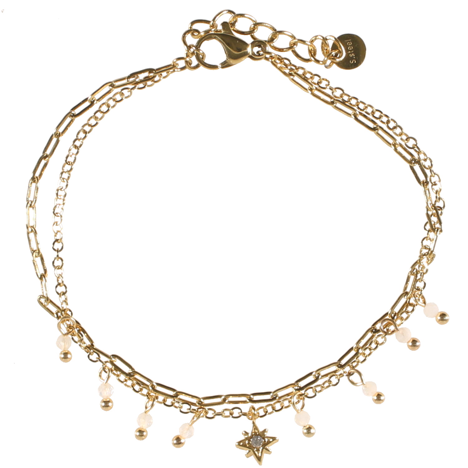 Bracelet double rangs composé d'une chaîne en acier doré et d'une chaîne en acier doré avec pampilles en véritable pierre de lune et d'une étoile en acier doré sertie d'un cristal.<br/>Fermoir mousqueton avec 3 cm de rallonge. Etoile Multirangs Perle Strass  Adolescent Adulte Femme Fille Indémodable Nature