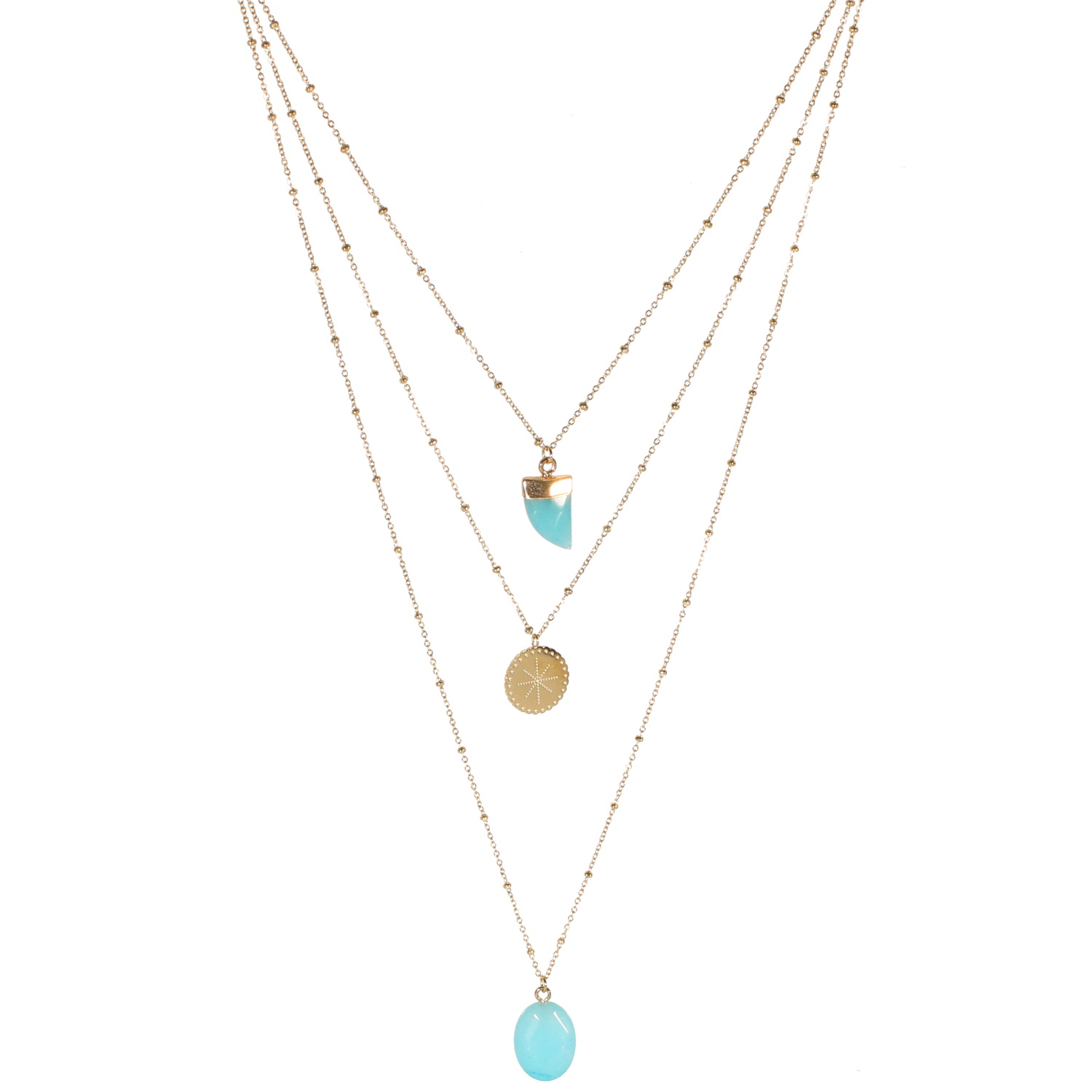 Collier triple rangs composé d'une chaîne de 39 cm de long en acier doré avec un pendentif en forme de dent en pierre de couleur turquoise, d'une chaîne de 46 cm de long avec un pendentif rond gravé d'une étoile en acier doré, ainsi qu'une chaîne de 60 cm de long en acier doré avec un pendentif en pierre de couleur turquoise de forme ovale.
