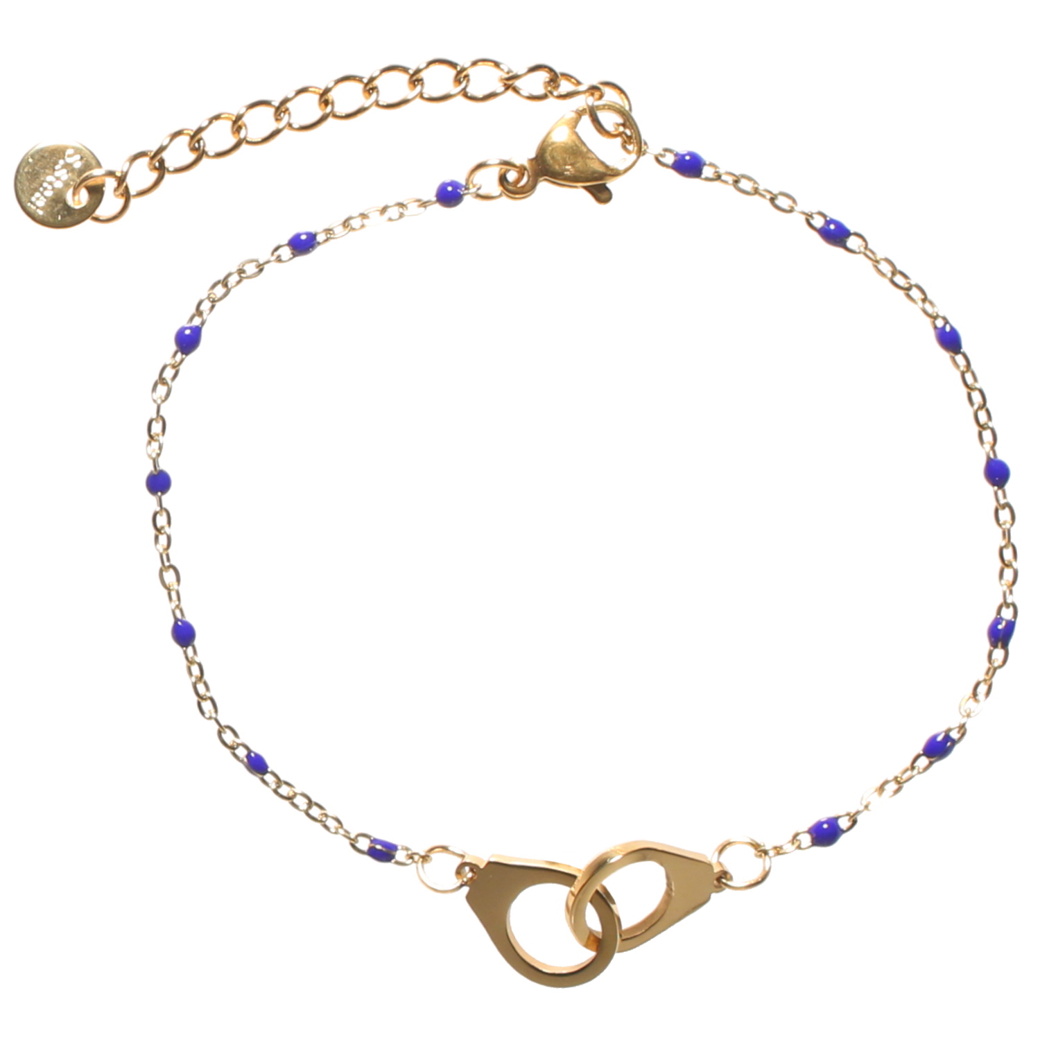 Description Bracelet composé d'une chaîne et d'une paire de menottes en acier doré et de perles en émail de couleur bleue. Fermoir mousqueton avec 3 cm de rallonge. Cliquez sur une matière, un thème, une couleur ou une collection pour voir tous les articles associés.
