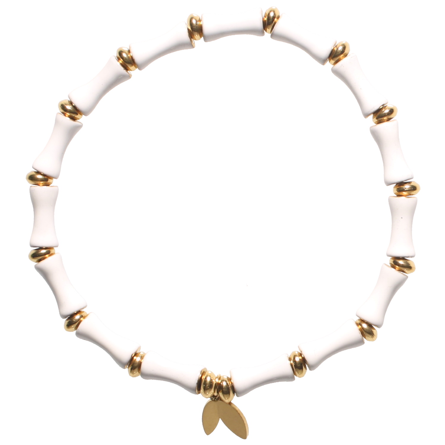 Bracelet élastique composé de perles cylindriques en acier doré, de perles en émail de couleur blanche et d'un pendant en forme de papillon en acier doré.