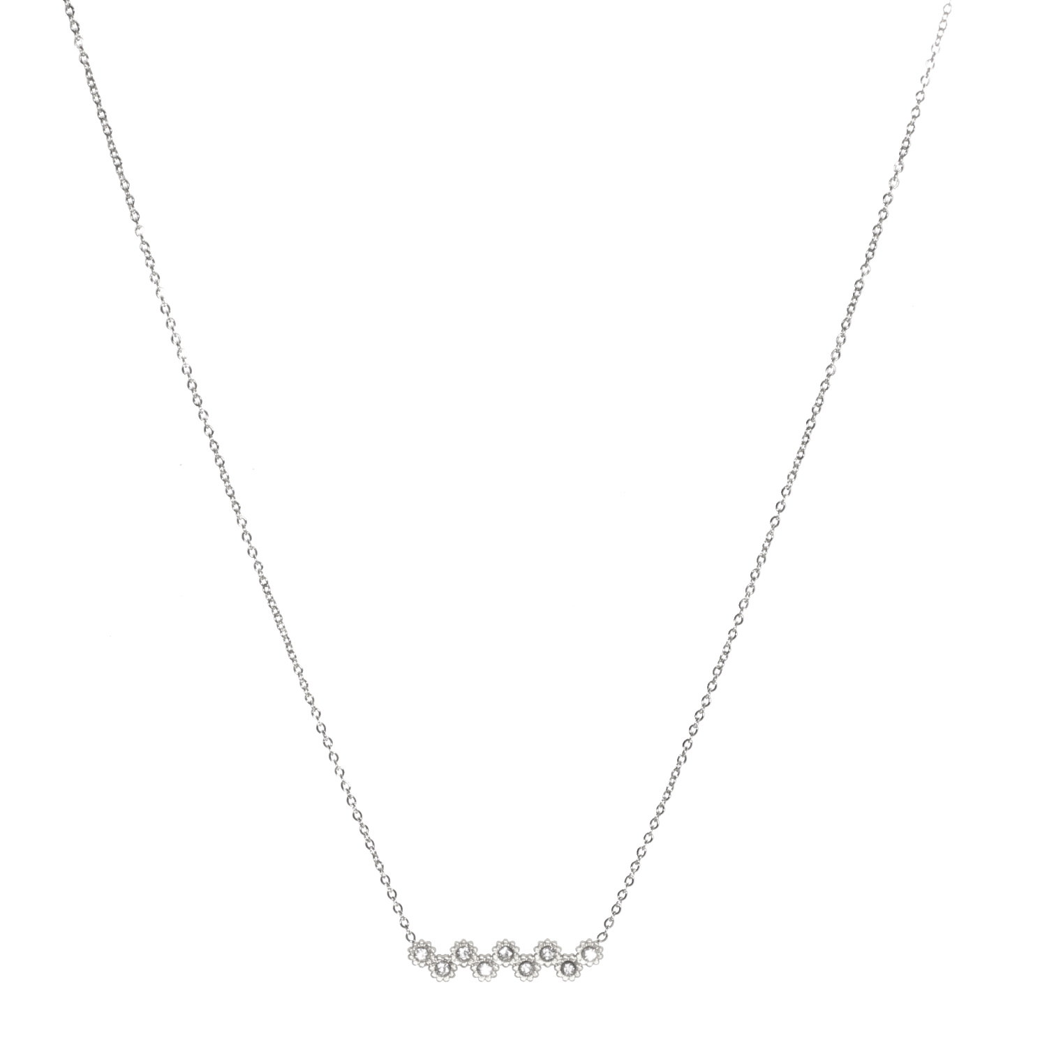 Description Collier composé d'une chaîne en acier argenté et d'un pendentif de 9 fleurs serties clos de strass. Fermoir mousqueton avec 5 cm de rallonge. Cliquez sur une matière, un thème, une couleur ou une collection pour voir tous les articles associés.