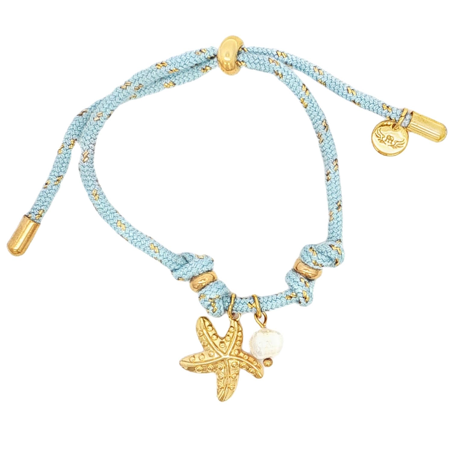 Le bracelet est confectionné à partir d'un cordon de coton tressé de couleur bleu azur, entrelacé de fils dorés subtils qui apportent une touche de lumière et rappellent le scintillement du soleil sur l'eau.