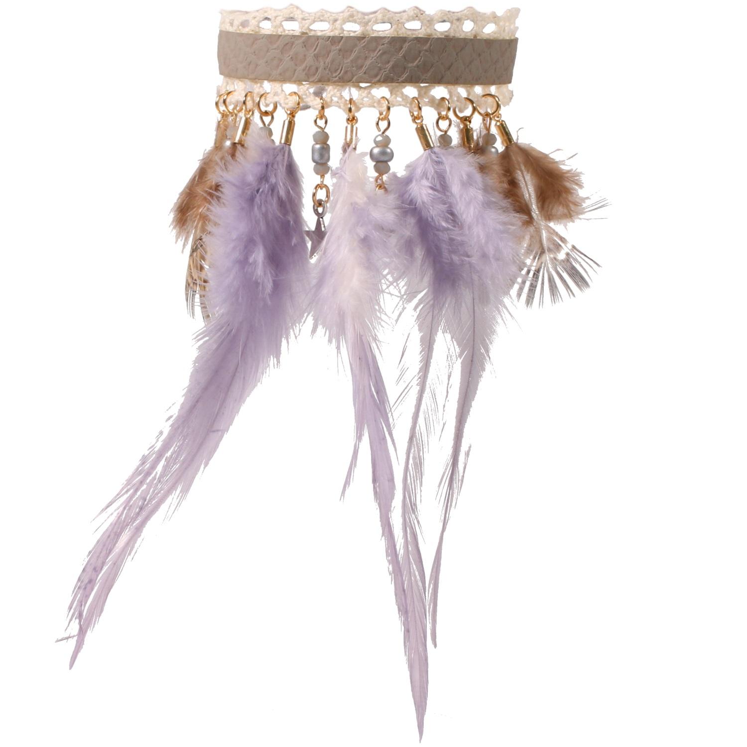 Bracelet fantaisie en textile, suédine, cristaux synthétiques, métal doré et plume.