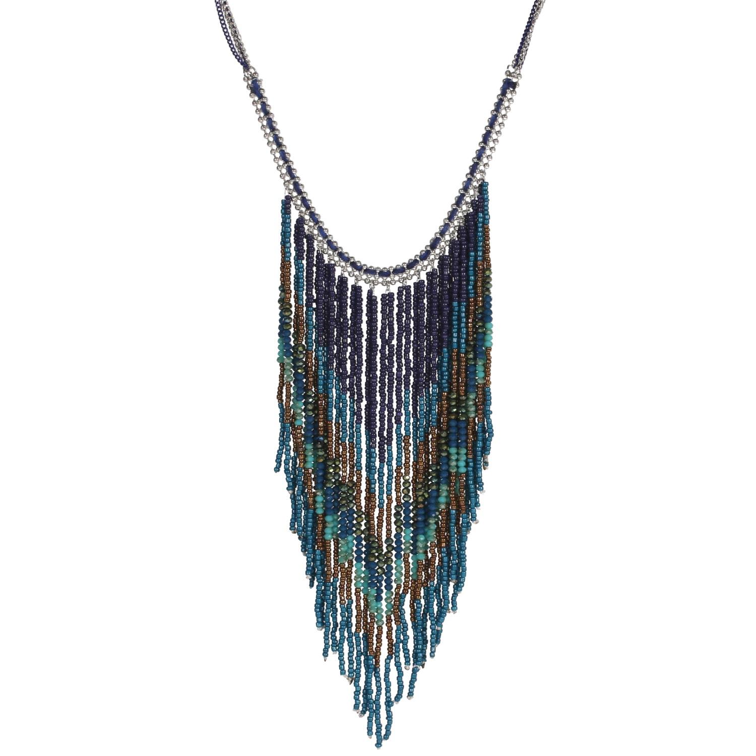 Collier fantaisie en métal argenté, métal peint, rocaille et textile.