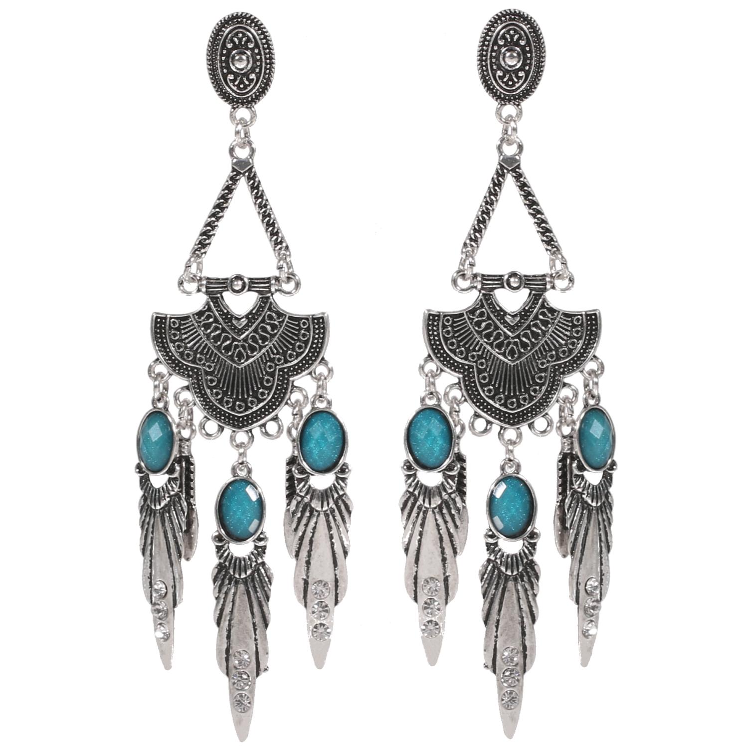 Boucles d'oreilles fantaisie en métal argenté vieilli, rocaille et cristaux synthétiques.