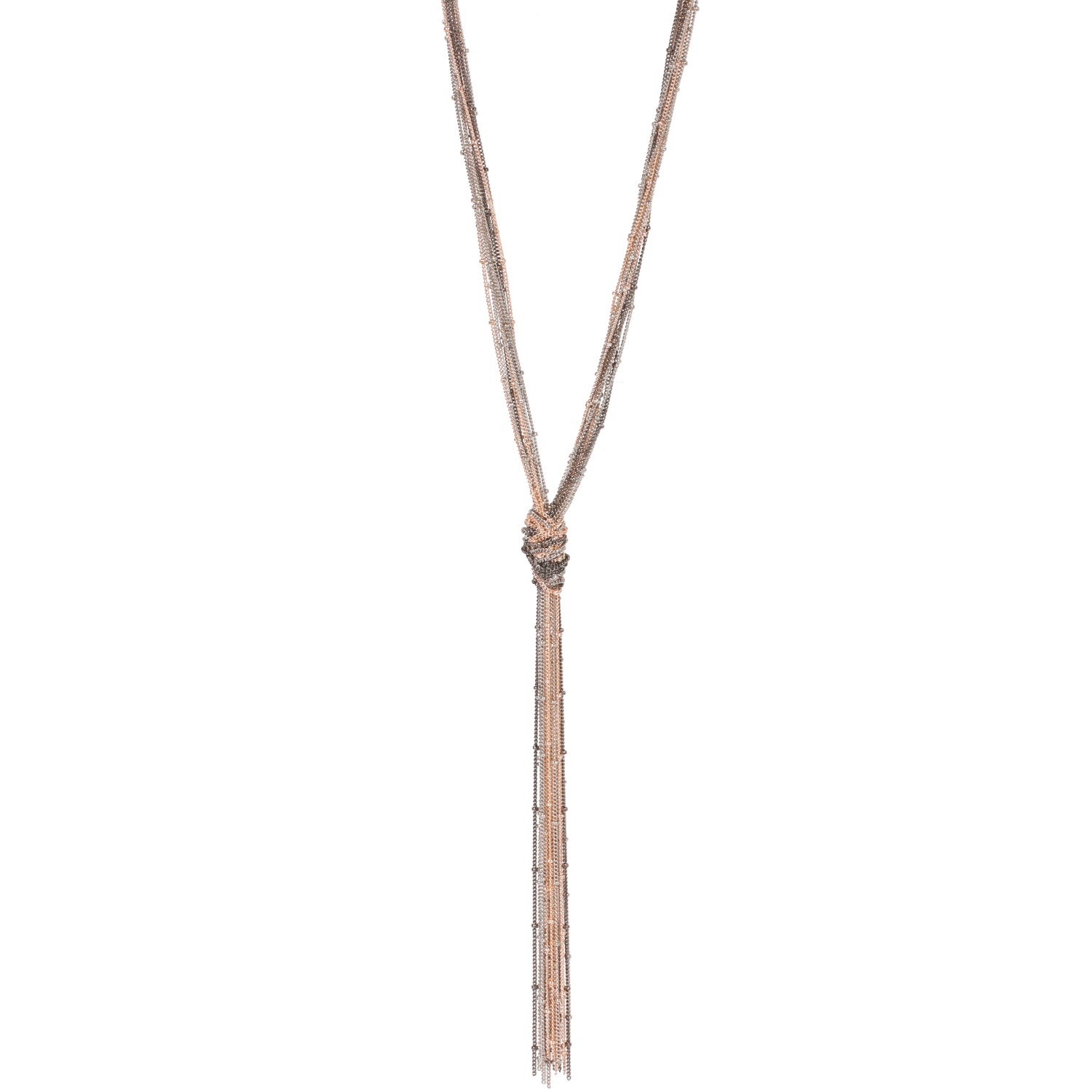 Collier sautoir en métal argenté, métal rosé et métal canon de fusil.