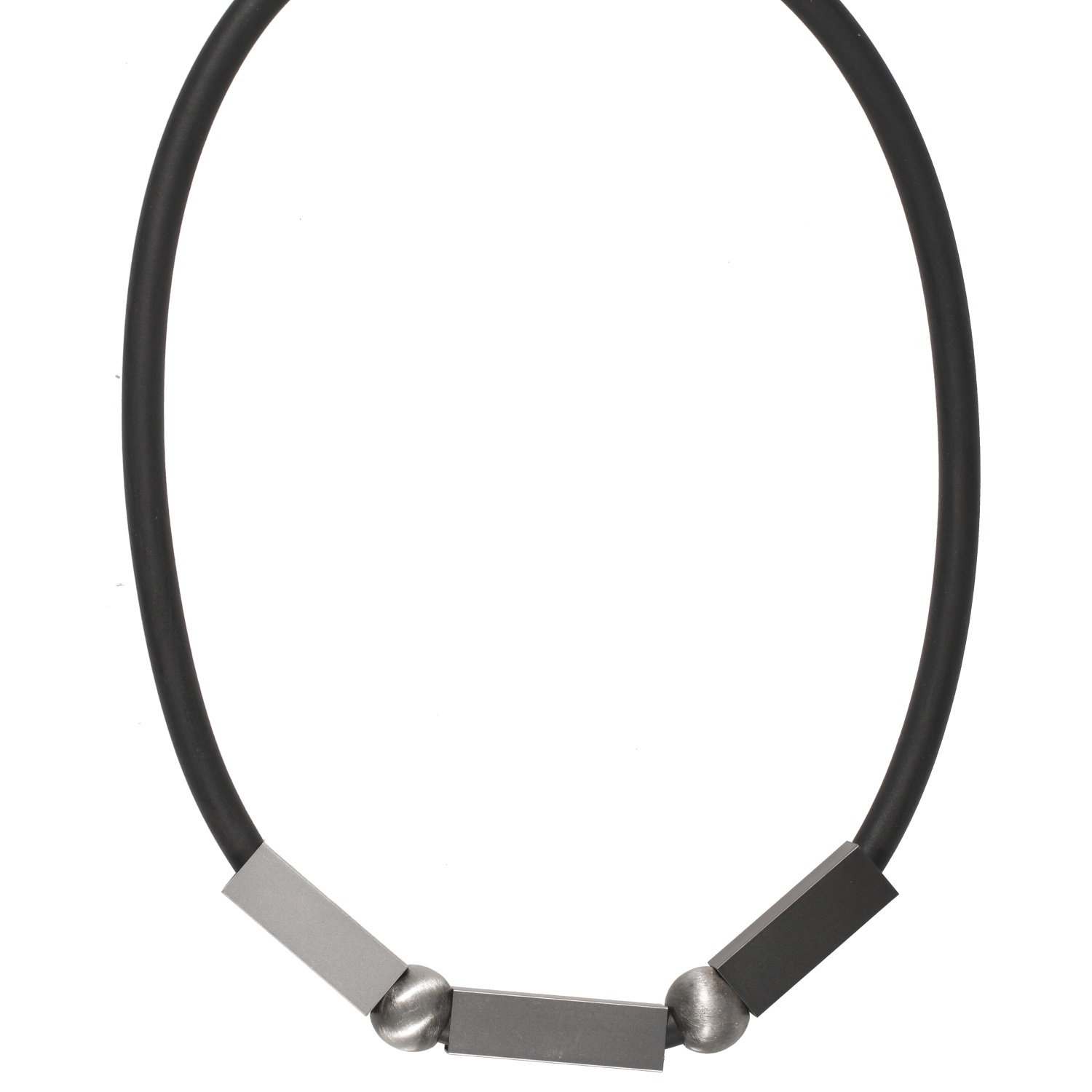 Collier fantaisie en métal argenté, métal canon de fusil et caoutchouc.