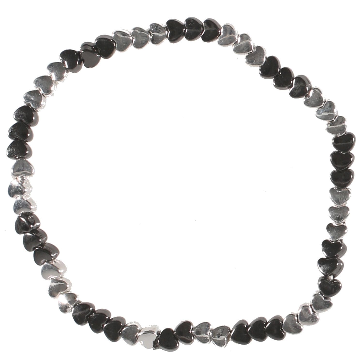 Bracelet fantaisie élastique Cœurs en métal argenté et métal canon de fusil.
