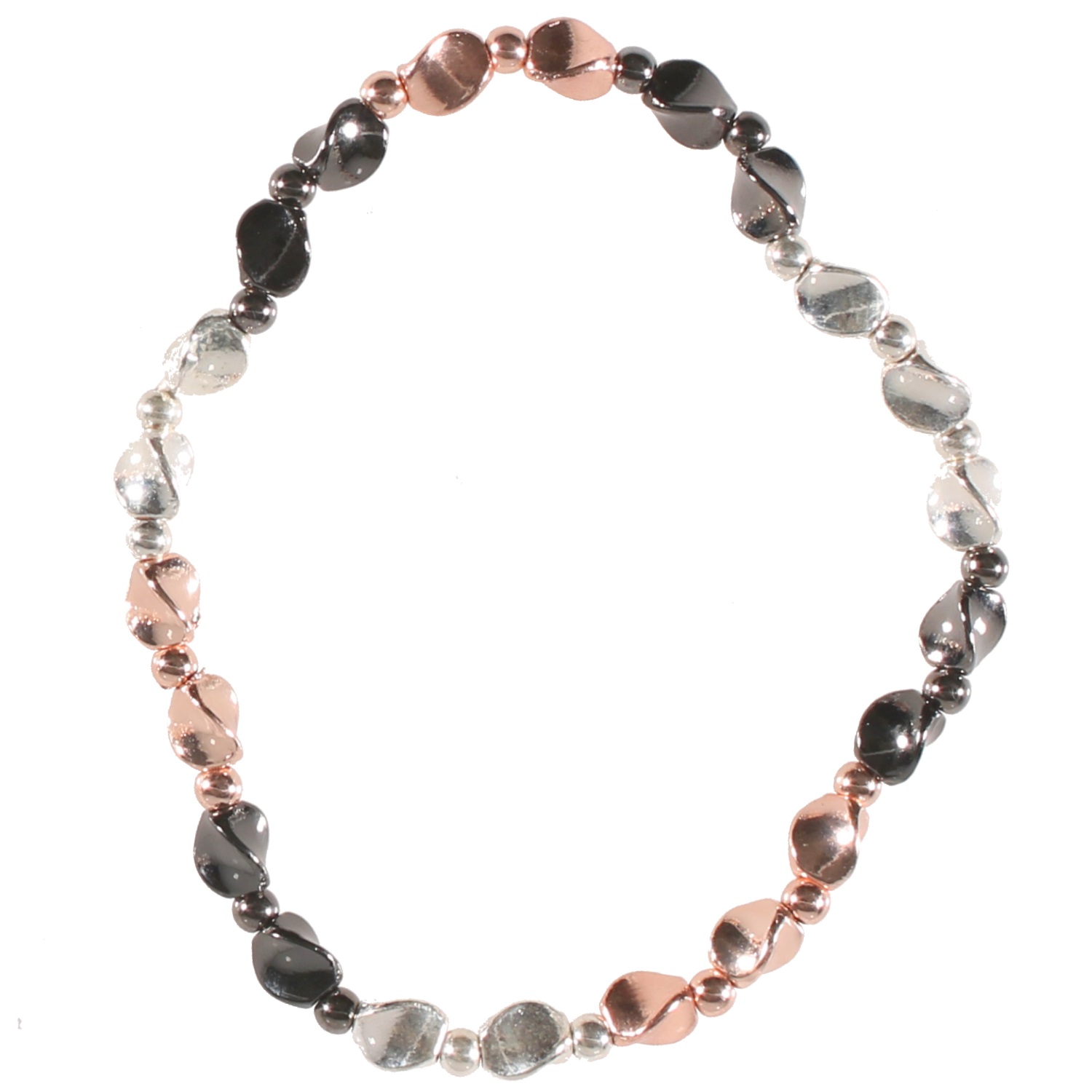 Bracelet fantaisie élastique en métal argenté, métal canon de fusil et métal rosé.