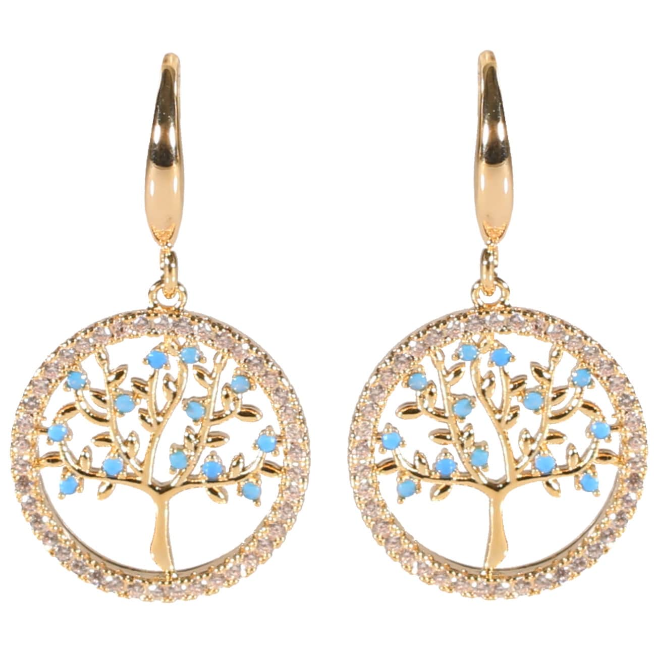 Boucles d'oreilles fantaisie avec cercles et arbres de vie en métal doré plaquage supérieur, strass en oxydes de zirconium et pierres d'imitation turquoise.