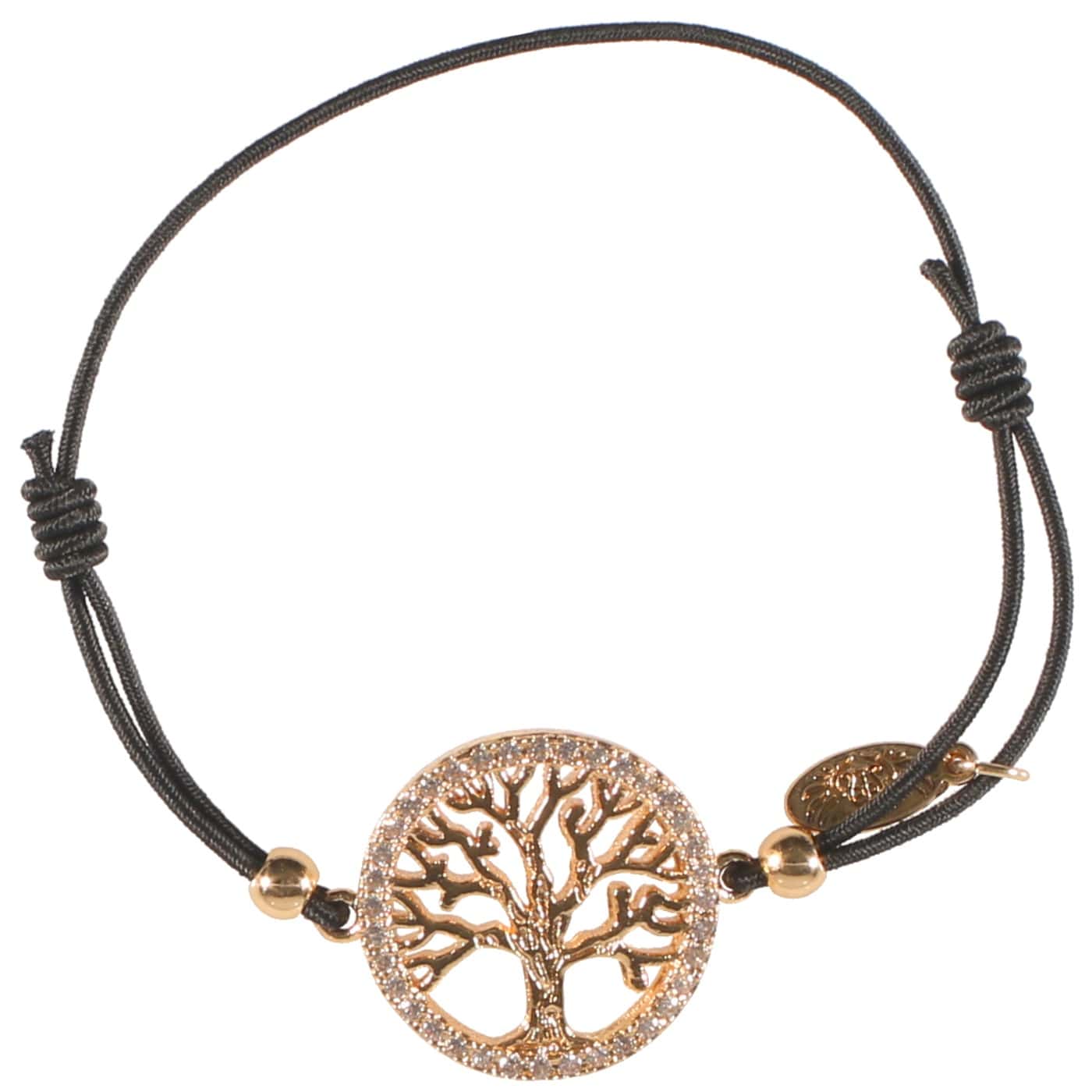 Bracelet fantaisie avec cordon élastique en coton, médaillon arbre de vie en métal doré et strass en oxydes de zirconium.