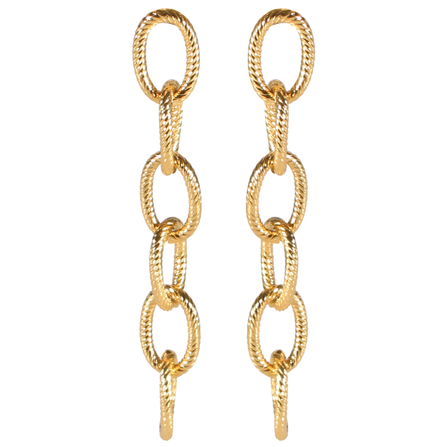 Description Boucles d'oreilles pendantes au motif de chaîne en acier doré. Largeur 9 mm Hauteur 60 mm Matière(s) Acier . L'acier utilisé dans la bijouterie existe sous plusieurs qualités. Nous utilisons principalement la qualité 316L, qualité qui est utilisée en chirurgie. Cet acier est donc inoxydable et reste très résistant. Fermoir Tiges poussettes Couleur(s) dominante(s) Doré Public Adolescent , Adulte . Genre Femme , Fille . Saison Indémodable . Collection Chainage contemporain Cliquez sur une matière, un thème, une couleur ou une collection pour voir tous les articles associés.