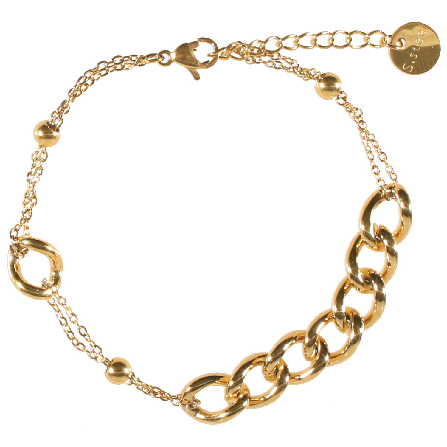 Description Bracelet composé de maillages différents en acier doré. Fermoir mousqueton avec 2.5 cm de rallonge. Cliquez sur une matière, un thème, une couleur ou une collection pour voir tous les articles associés.