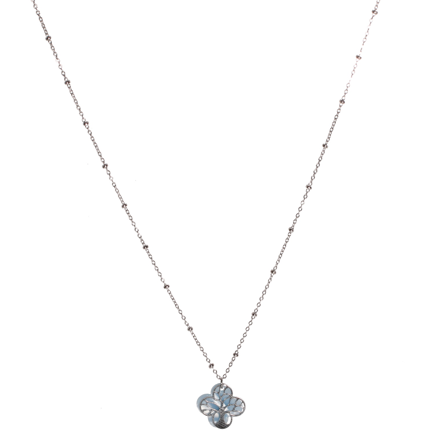 Collier composé d'une chaîne avec un pendentif arbre de vie en acier argenté et d'un pendentif de couleur bleu.