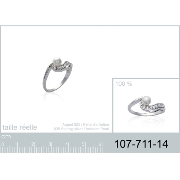 Bague en argent 925/000 rhodié, oxyde de zirconium et perle d'imitation. Boule Perle  Adulte Femme Indémodable Mariage