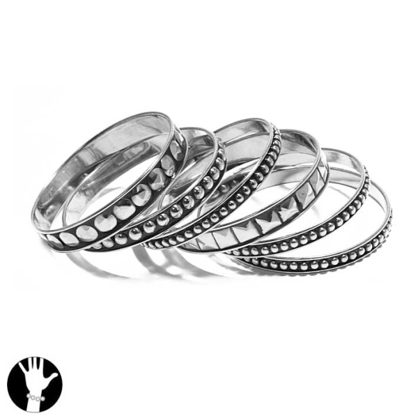 Lot de 5 bracelets fantaisie rigides en métal argenté vieilli.