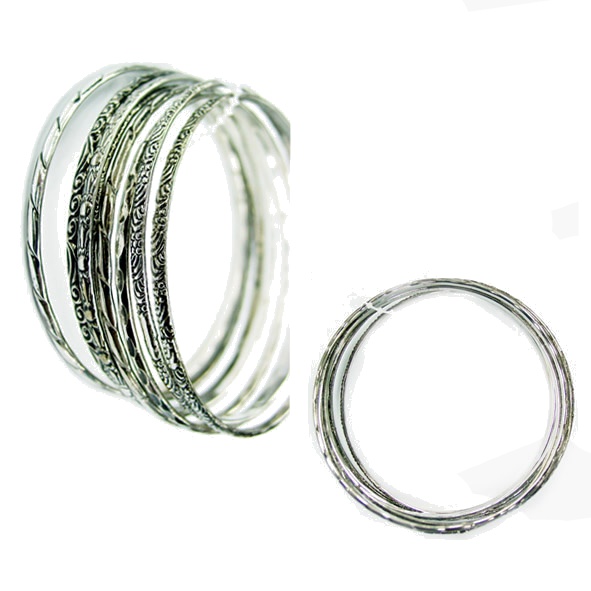 Lot de 8 bracelets fantaisie rigides en métal argenté vieilli.