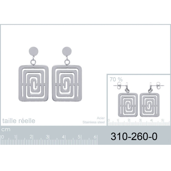 Description Boucles d'oreilles en acier. Largeur 18 mm Hauteur 40 mm Matière(s) Acier . L'acier utilisé dans la bijouterie existe sous plusieurs qualités. Nous utilisons principalement la qualité 316L, qualité qui est utilisée en chirurgie. Cet acier est donc inoxydable et reste très résistant. Fermoir Tiges poussettes Couleur(s) dominante(s) Argenté Public Adulte . Genre Femme . Saison Indémodable . Cliquez sur une matière, un thème, une couleur ou une collection pour voir tous les articles associés.