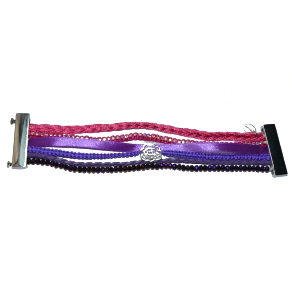 Bracelet fantaisie en métal argenté, textile et verre.