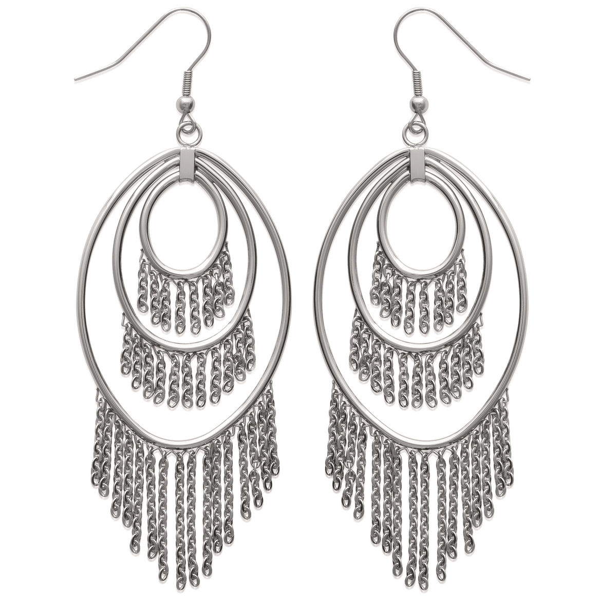 Description Boucles d'oreilles en acier. Largeur 38 mm Hauteur 100 mm Matière(s) Acier . L'acier utilisé dans la bijouterie existe sous plusieurs qualités. Nous utilisons principalement la qualité 316L, qualité qui est utilisée en chirurgie. Cet acier est donc inoxydable et reste très résistant. Fermoir Crochets Couleur(s) dominante(s) Argenté Public Adulte . Genre Femme . Saison Indémodable . Cliquez sur une matière, un thème, une couleur ou une collection pour voir tous les articles associés.