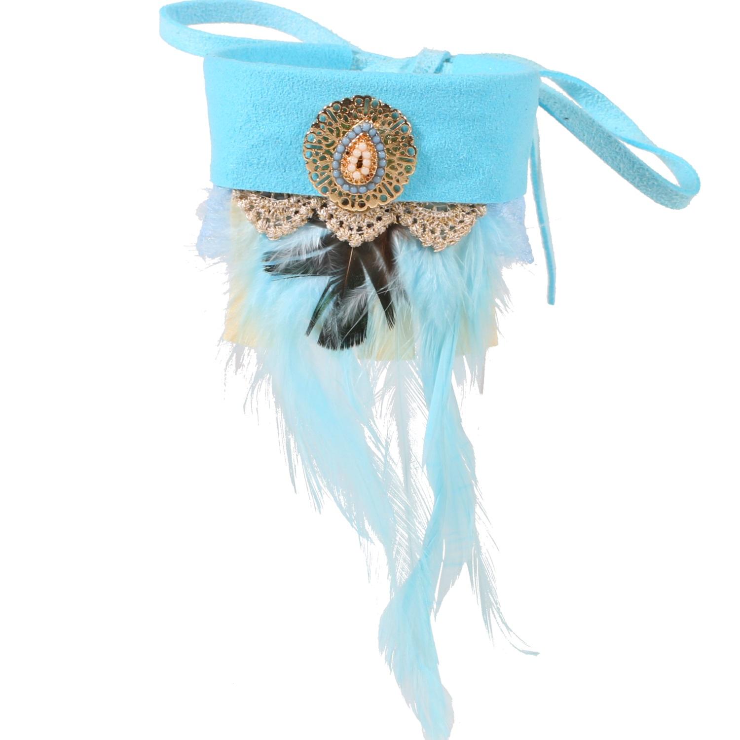 Bracelet/Chaîne cheville fantaisie en suédine, textile, métal doré, plume et résine.