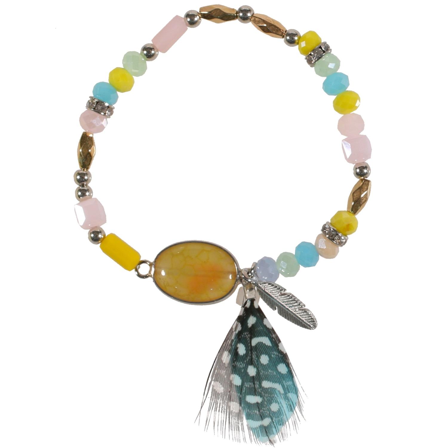 Bracelet fantaisie en métal doré, métal argenté, plume, cristaux synthétiques et résine.