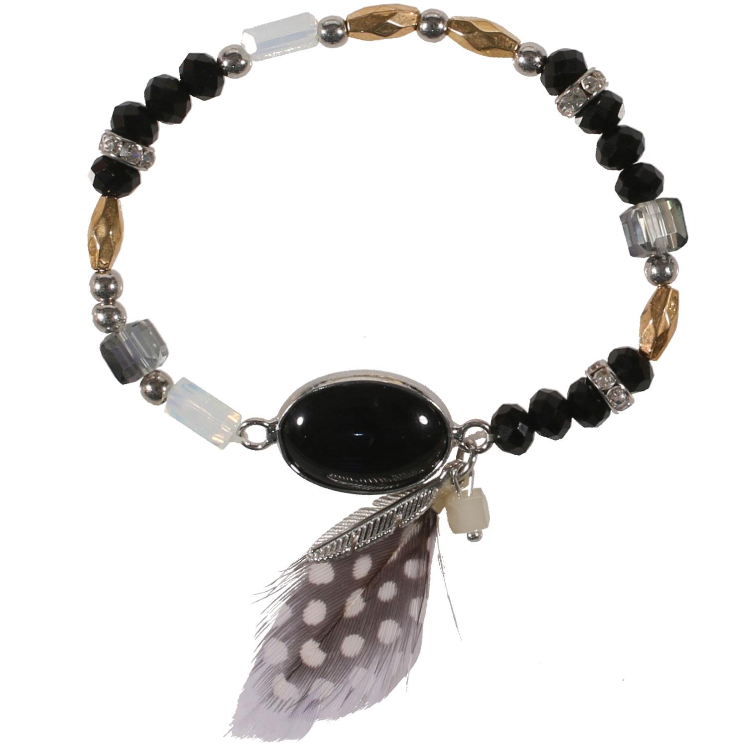 Bracelet fantaisie en métal doré, métal argenté, plume, cristaux synthétiques et résine.  Plume  Adulte Eté Femme