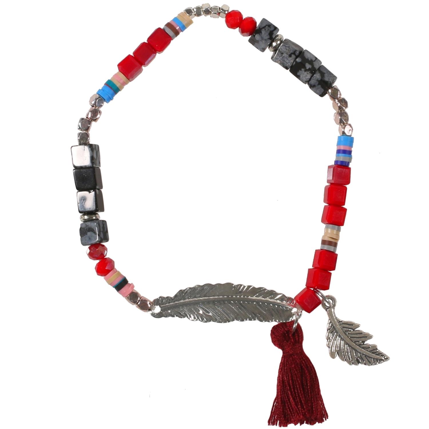 Bracelet fantaisie en métal argenté, résine, rocaille, caoutchouc et textile.