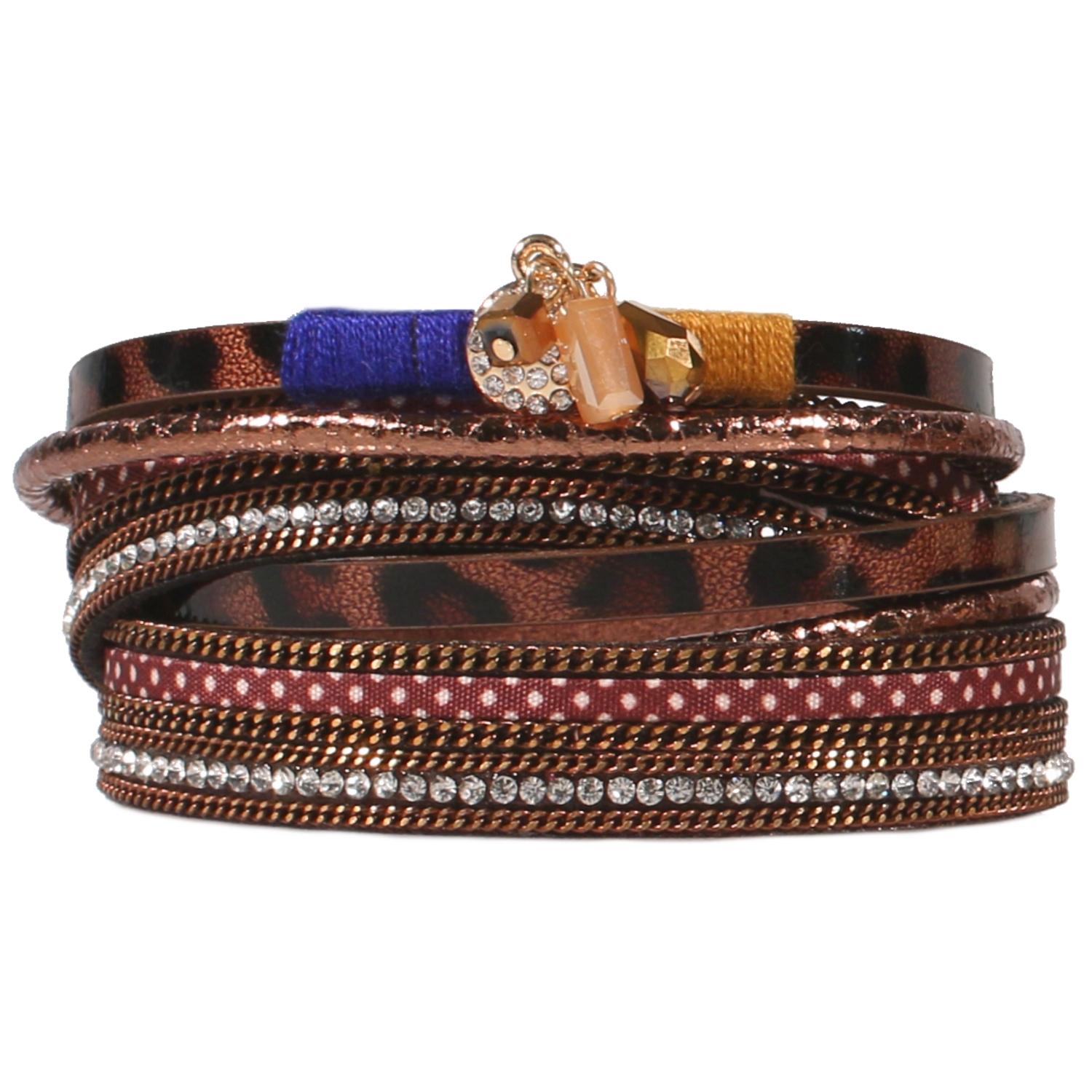 Bracelet fantaisie en métal doré, métal peint, suédine, résine, cristaux synthétiques et textile.