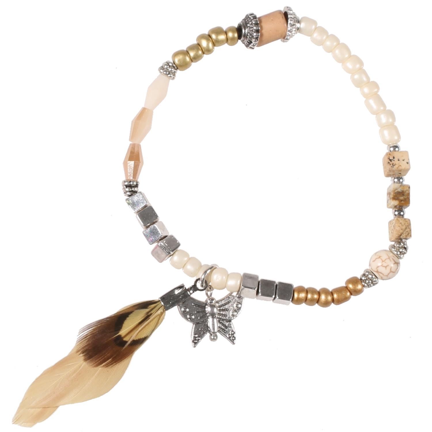Bracelet fantaisie en métal argenté, résine, rocaille et plume.