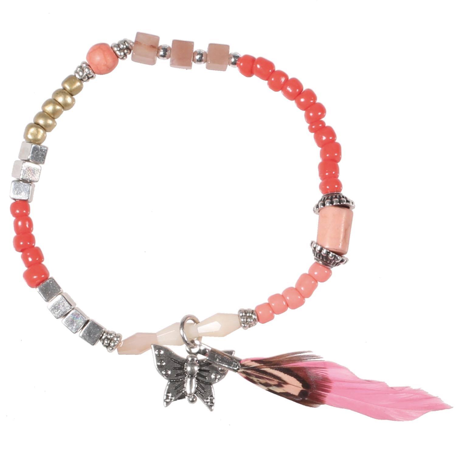 Bracelet fantaisie en métal argenté, résine, rocaille et plume.