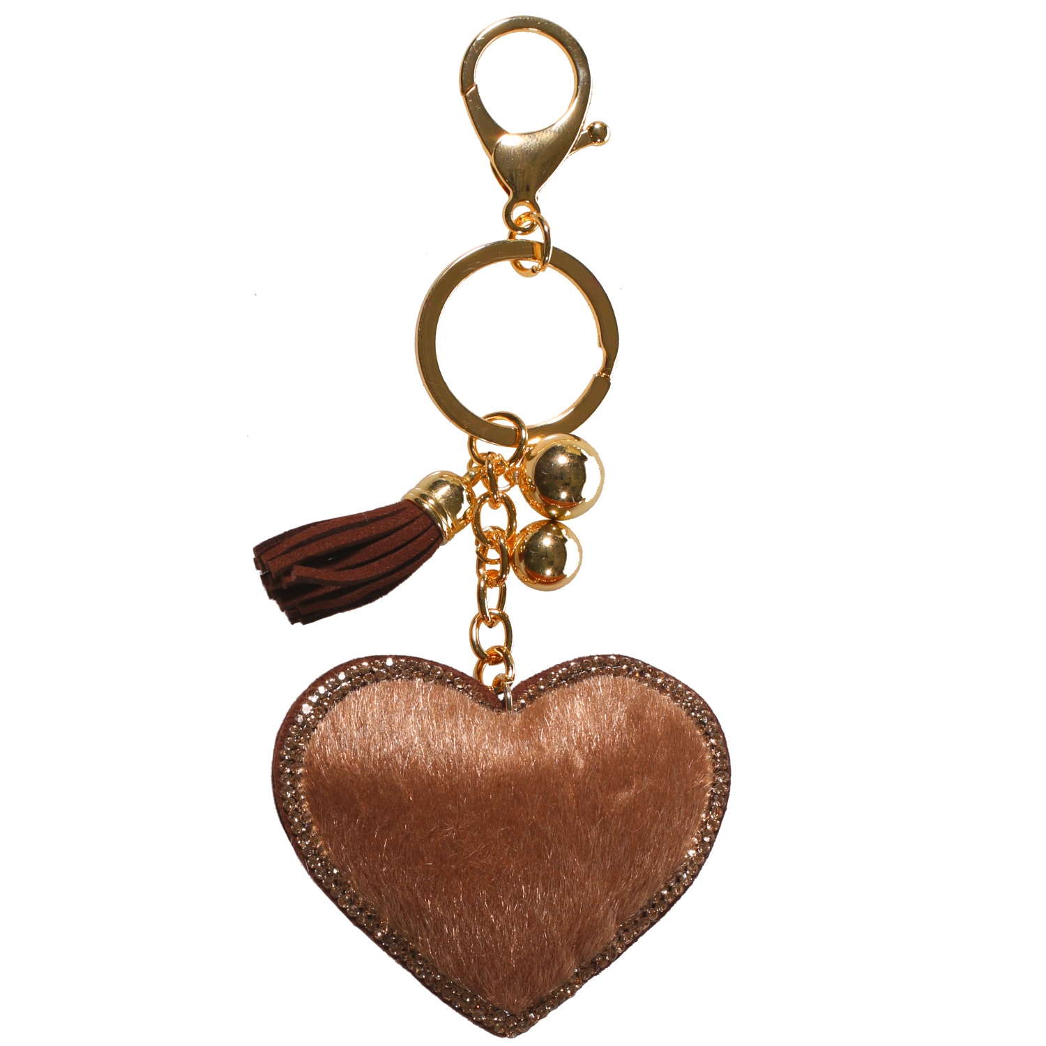 Porte-clés Cœur en métal doré, suédine, textile et cristaux synthétiques.