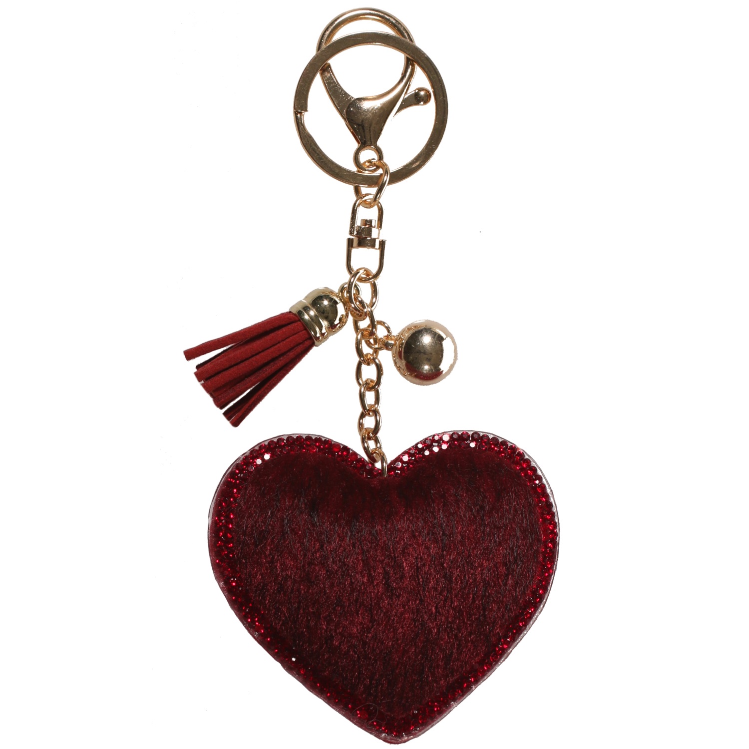 Porte-clés Cœur en métal doré, suédine, textile et cristaux synthétiques.
