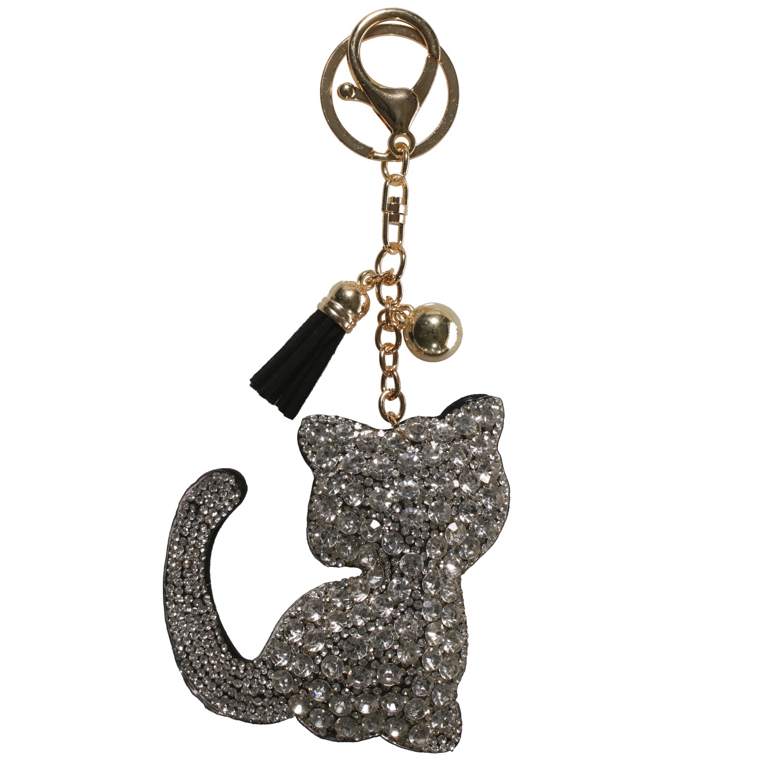 Porte-clés en métal doré, suédine et cristaux synthétiques.