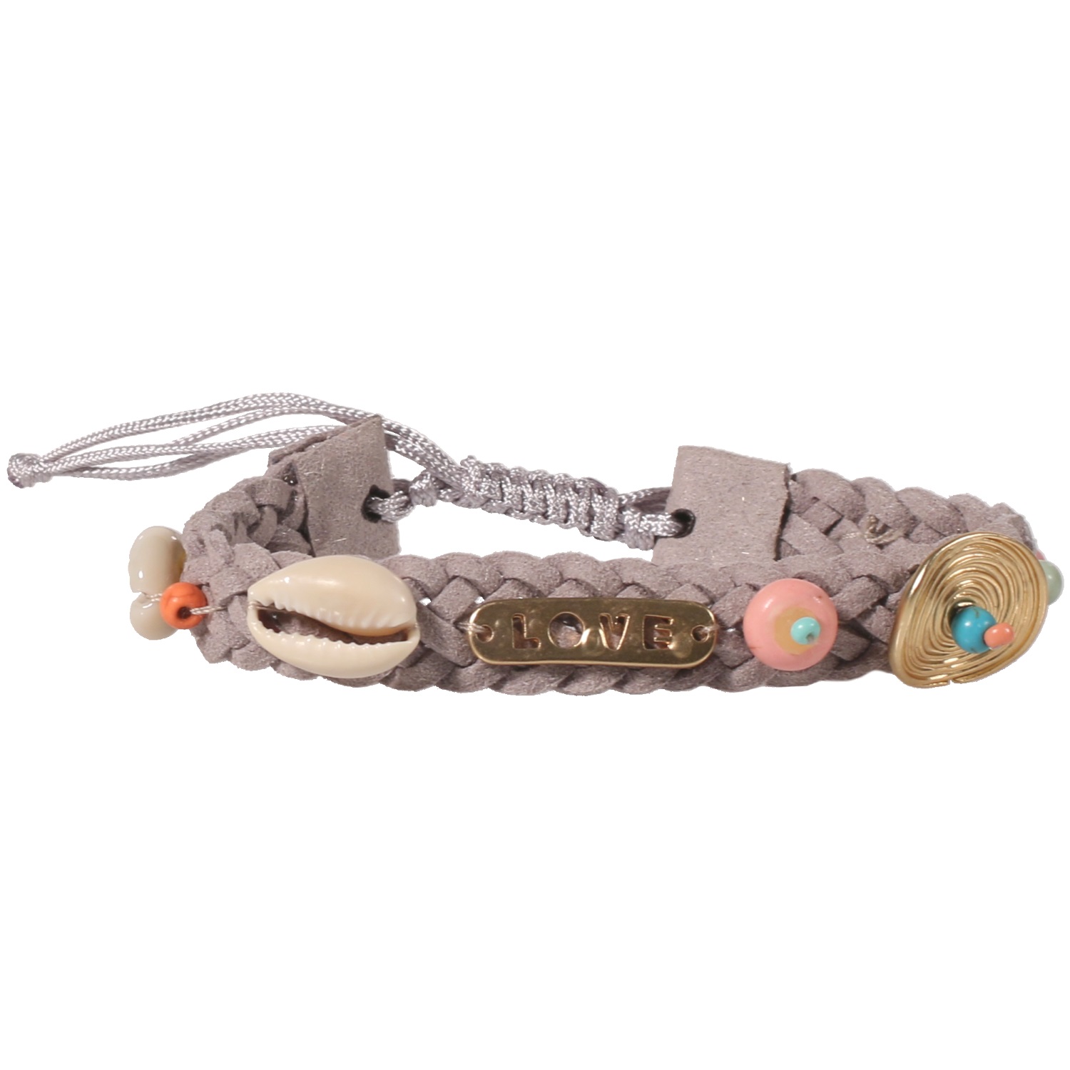 Bracelet fantaisie en suédine, textile, métal doré, rocaille et coquillage.