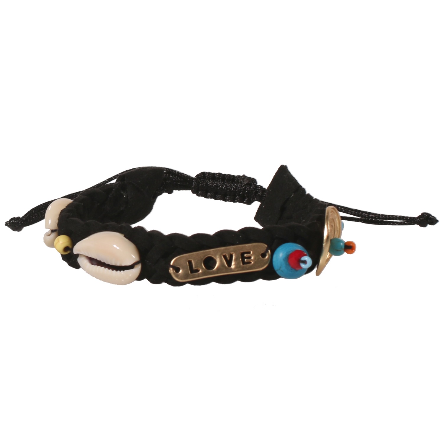 Bracelet fantaisie en suédine, textile, métal doré, rocaille et coquillage.