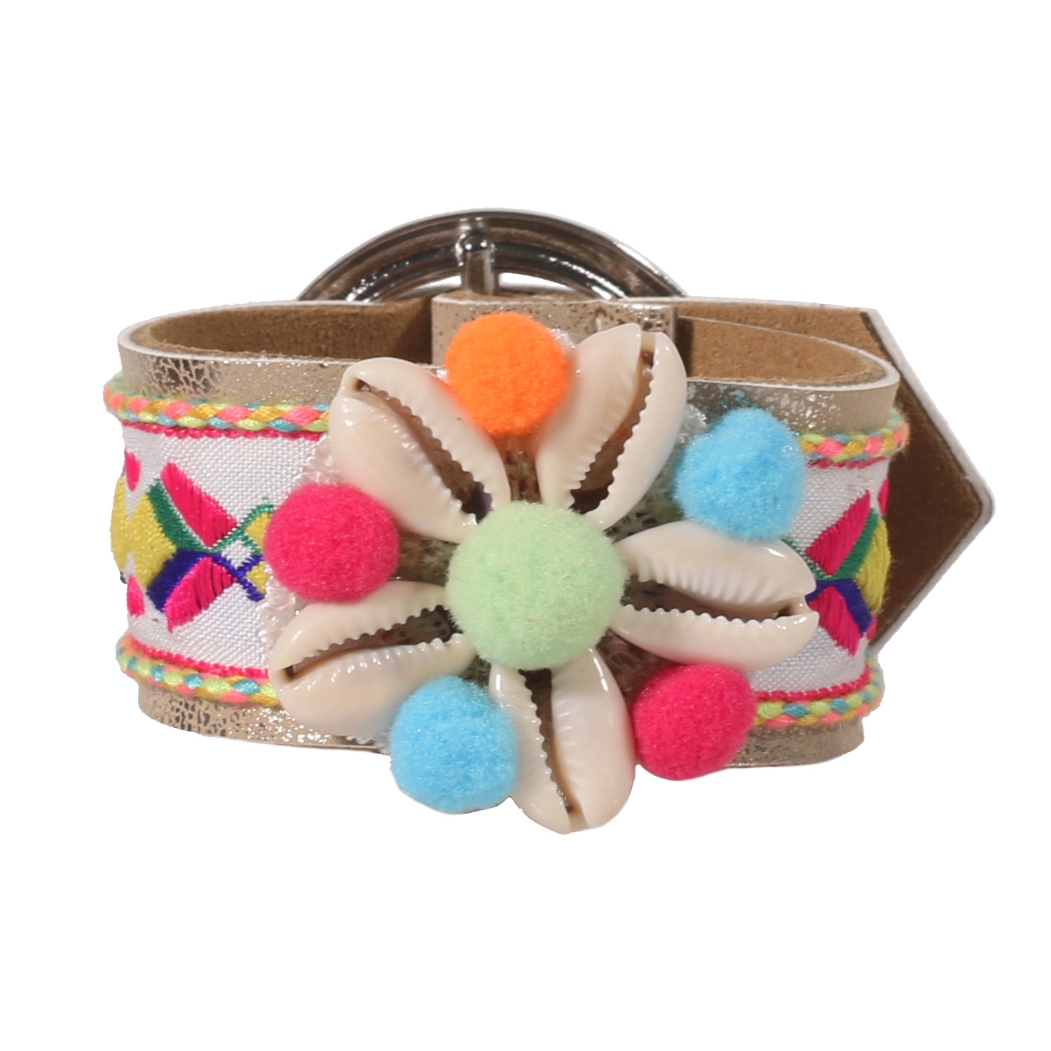 Bracelet ceinture fantaisie en suédine, textile, métal argenté et coquillage.