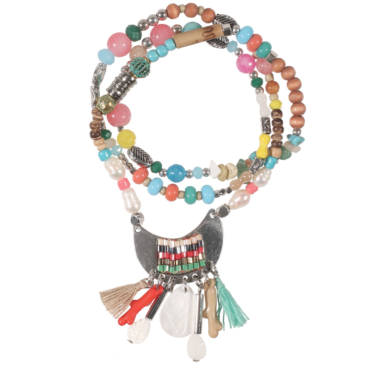 Bracelet fantaisie élastique multi tours en métal argenté, métal peint, bois, caoutchouc, nacre, résine, pierres synthétiques et textile.