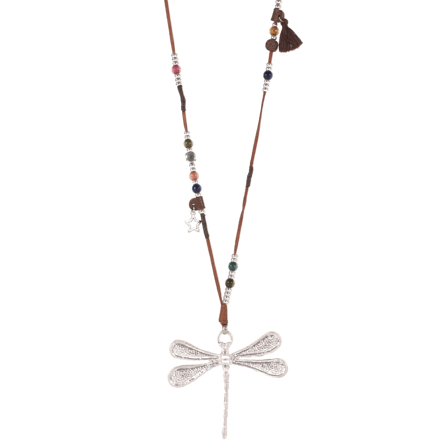 Collier sautoir Libellule en métal argenté, suédine, textile et perles en pierre synthétique et pierre d'imitation de lave volcanique.