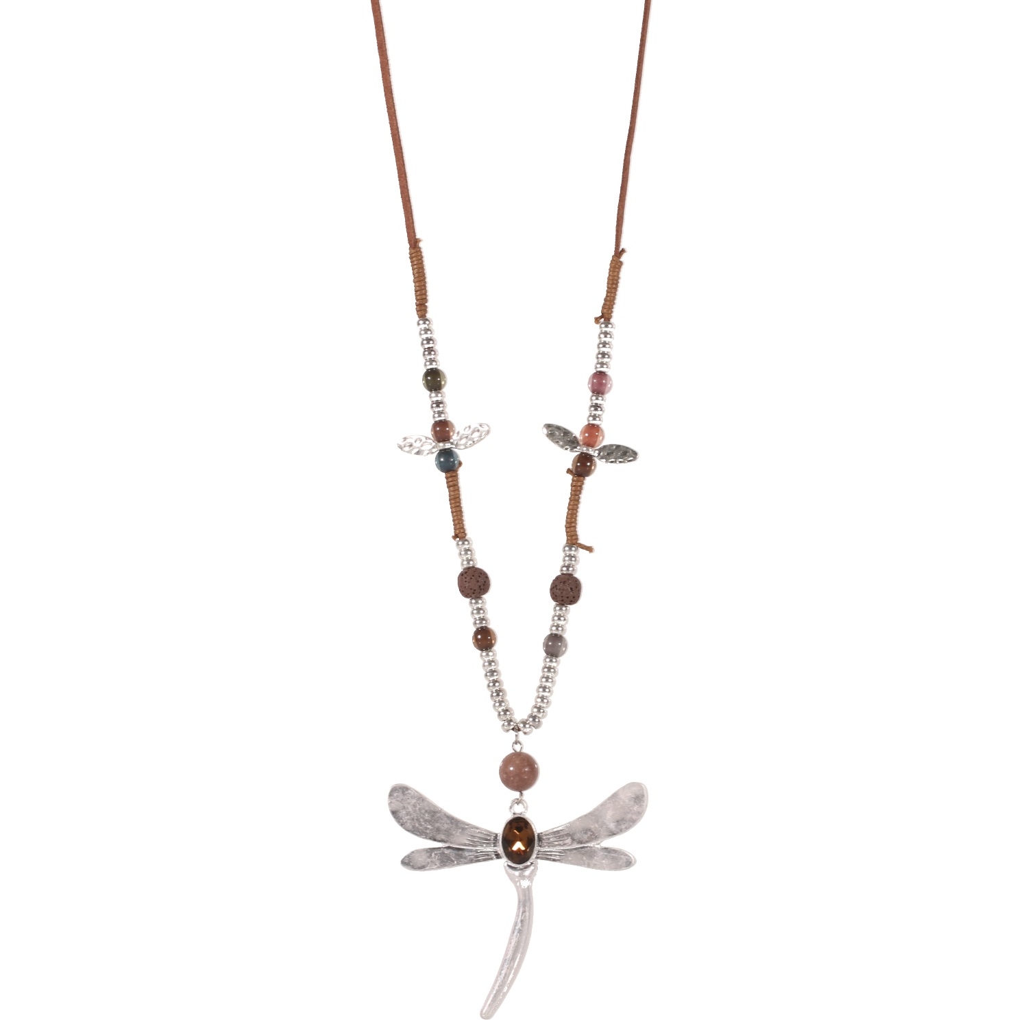 Collier sautoir Libellule en métal argenté, suédine, textile, pierres synthétiques et pierres d'imitation de lave volcanique.