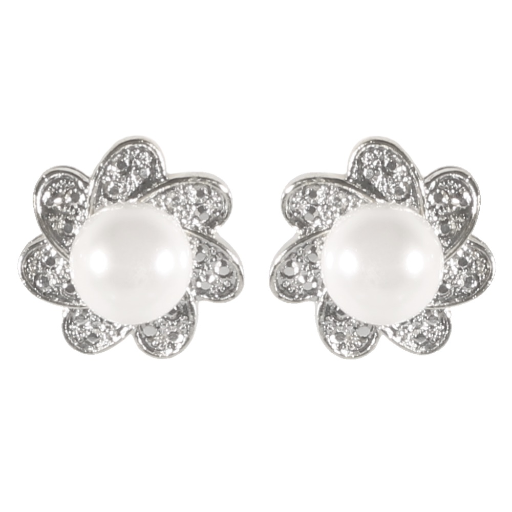 Boucles d'oreilles fantaisie fleurs en métal argenté et perles synthétiques.