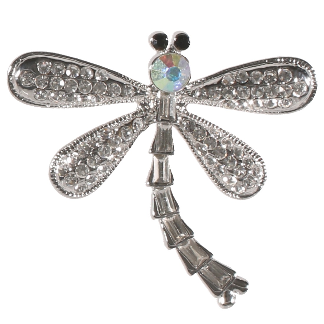 Broche fantaisie libellule en métal argenté, cristaux noirs et transparents et strass couleur cristal.