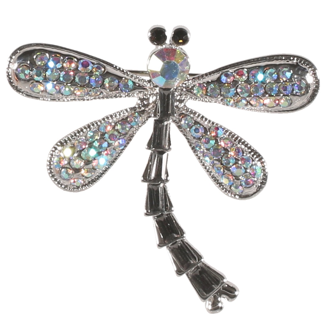 Broche fantaisie libellule en métal argenté, cristaux de couleur et strass couleur cristal.