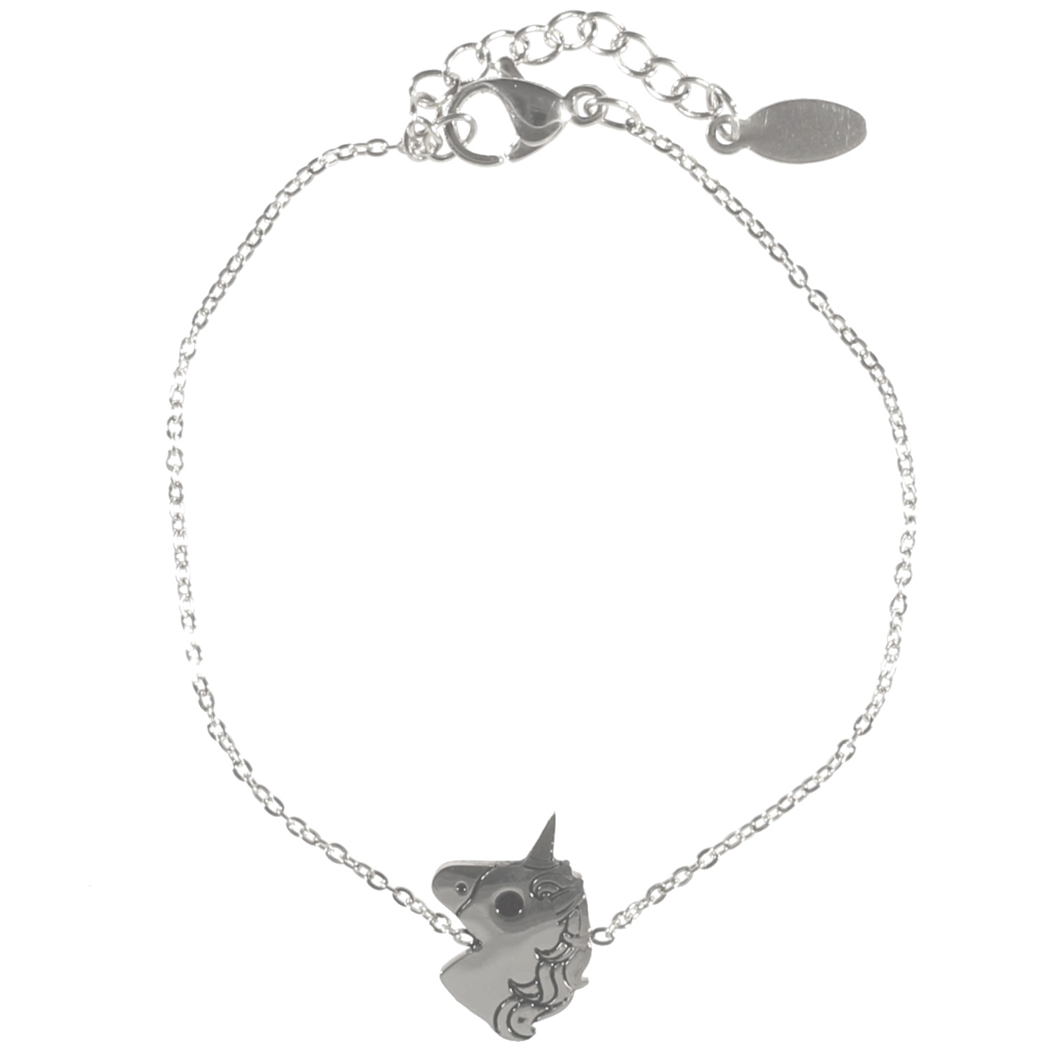 Description Bracelet avec tête de licorne en acier argenté. Longueur 15+3 cm [Guide des tailles] Largeur 15 mm Matière(s) Acier . L'acier utilisé dans la bijouterie existe sous plusieurs qualités. Nous utilisons principalement la qualité 316L, qualité qui est utilisée en chirurgie. Cet acier est donc inoxydable et reste très résistant. Fermoir Mousqueton Couleur(s) dominante(s) Argenté Public Adolescent , Enfant . Genre Fille . Saison Indémodable . Thème(s) Animaux . Cliquez sur une matière, un thème, une couleur ou une collection pour voir tous les articles associés.